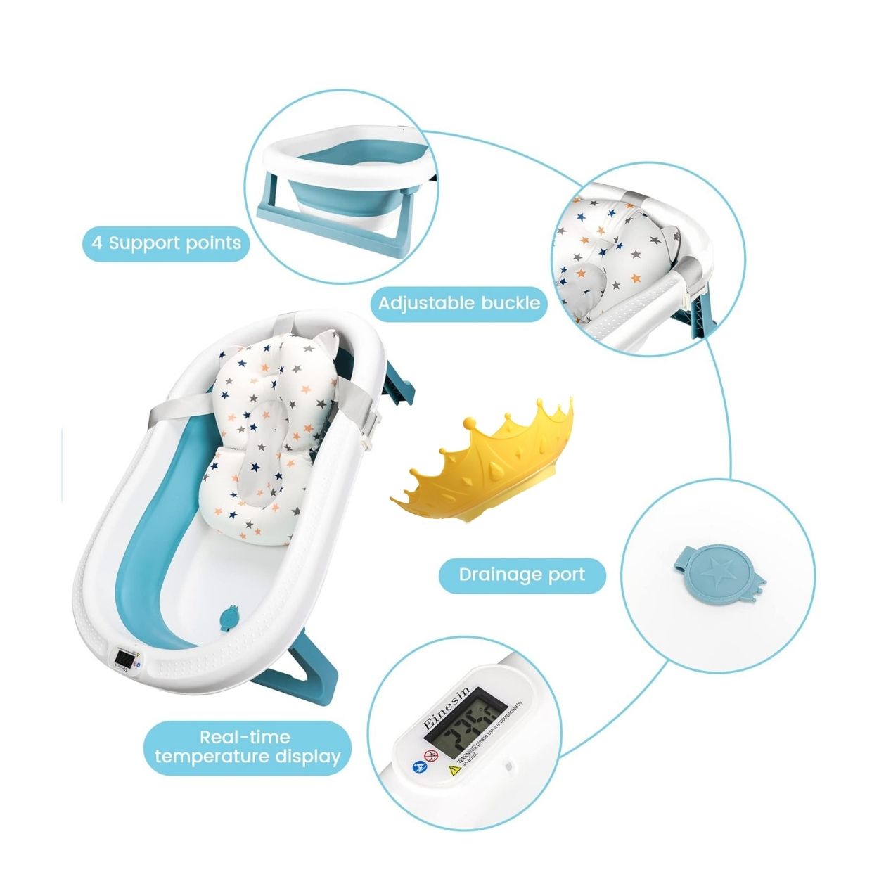 Termómetro integrado: Permite monitorear la temperatura del agua en tiempo real para asegurar que sea seguro y cómodo para el bebé.